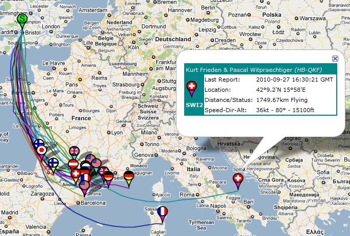 There are still six teams in the air, and they are now committed to flying through the night over the Mediterranean sea. The remaining teams are: SWI2, FRA2, GER2, GER1, GBR3 and USA2. Remember that the teams cannot fly within 5nm of Italian soil during the hours of darkness (they have until 30 minutes after sunset to clear Italian soil and can arrive again 30 minutes before sunrise)