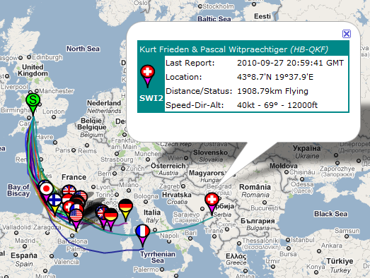 As the teams head towards midnight, we still have one balloon - SWI2 - 300km ahead of the others. The team of Kurt Frieden and Pascal Witpraechtiger crossed over Croatia and into Serbia earlier this evening, and are still flying at 40kts at 12000'. They have been between 3000m (10,000ft) and 4600m (15,000ft) for over 26 hours.